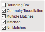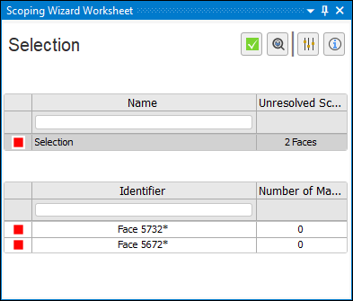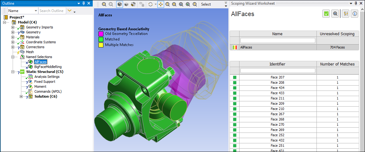 The application displays reference annotations in the legend as well as highlights on the part(s) in the Geometry window, based on the state of the recovered reference. The application displays matched references display as green, multiple matches yellow, old geometry tessellation in purple, and if no match is available, the reference is drawn in red. Furthermore, the worksheet uses the color scheme to indicate if one or more of the conditions exists, such as the Named Selection, AllFaces, example shown in the table below that displays all three colors. See the Display and Recovery Options topic below for more information about annotations.