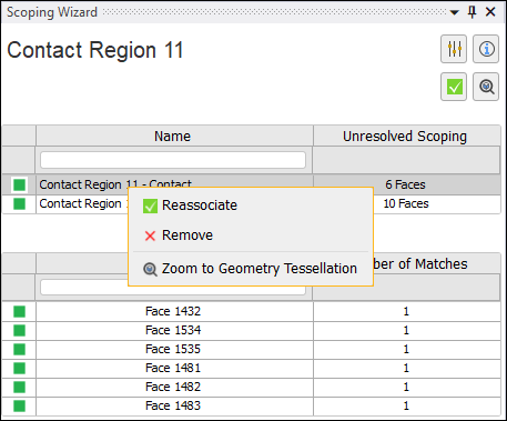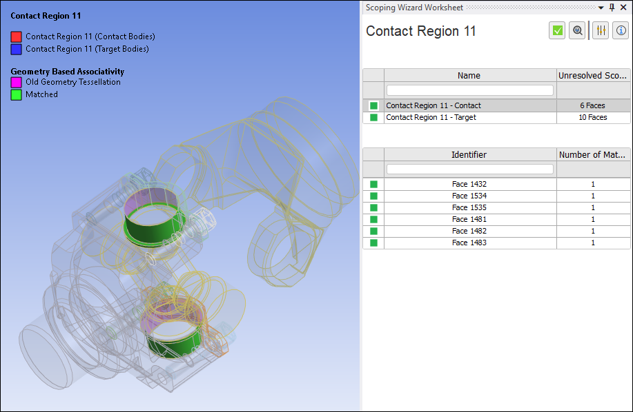 If you double-click a table row, or select an unresolved object in the tree, the pane shows information specific to the object and its (unresolved) scoping. The following example shows a Contact Region that has lost scoping. The pane displays the object type/name (Contact Region), the number of unresolved geometric entities, whether the application identified a scoping match, and the original application-assigned ID for the entities. The first item in the worksheet is selected by default, and the parts are highlighted in the Geometry window.
