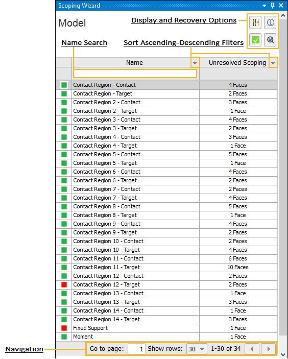 Filter the list based on object name or number of unresolved scopings (ascending/descending).