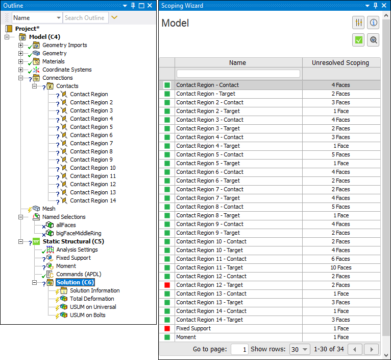 Selecting the ribbon option displays the Scoping Wizard worksheet pane, illustrated below, that lists all objects with unresolved scoping. Corresponding objects in the tree also display with an invalid state.