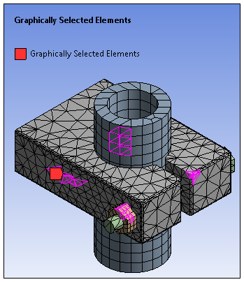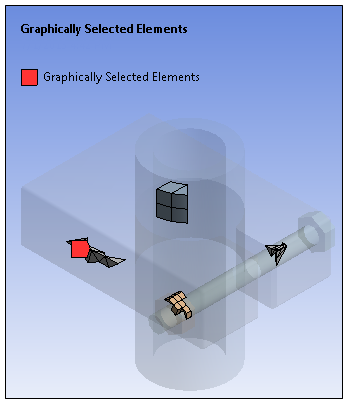 An example element-based Named Selection is illustrated below. The example is named Graphically Selected Elements. When the Show Mesh feature is active, as illustrated in the first image, the elements of a named selection (or multiple named selections) are highlighted. Otherwise, the elements are drawn and the remained of the model is transparent, as illustrated in the second image.