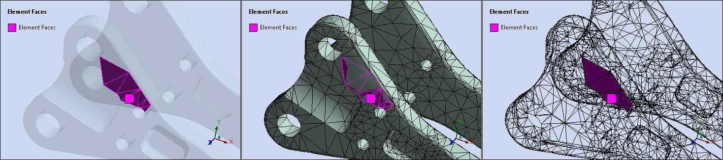 Once you have generated the mesh on your model, you can select one or more elements or element faces on your mesh using the Element or Element Face selection filter on the Graphics Toolbar as well as the options of the Select Mode drop-down menu. The following topics describe element-based selection methods and features: