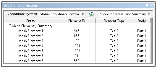As illustrated below, you can view information about your element/element face selections, such as Element Type, Element ID, as well as the body that the element is associated with using the Selection Information window. Once you have selected your desired element or elements, display the window by selecting the option from the Tools group on the Home tab.
