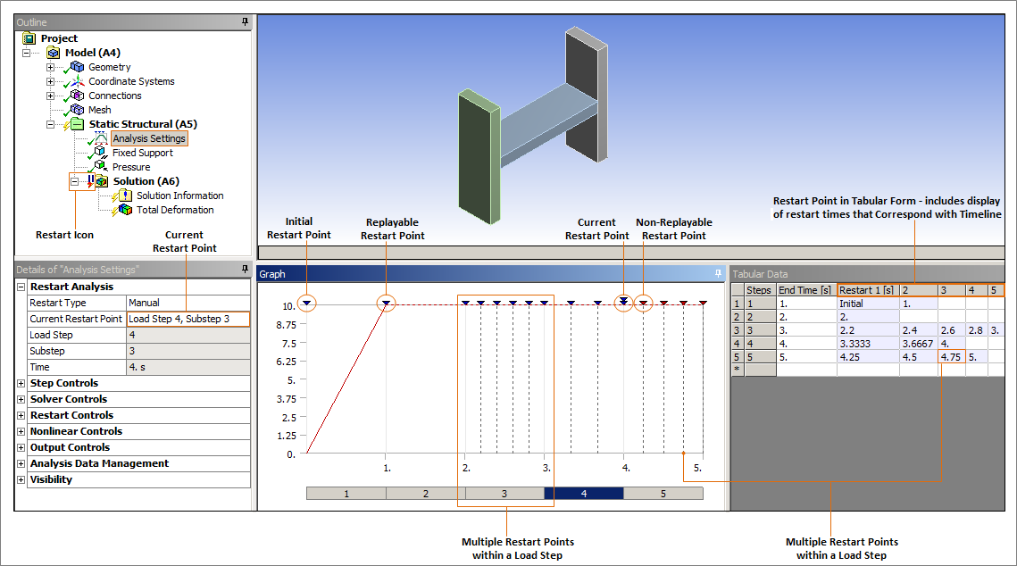 Once restart points are generated, they will be visible in several forms. For an overview, select the Analysis Settings object and refer to the Graph window where restart points are symbolized by triangular markers atop the timeline. The Tabular Data window lists the restart points within each load step.