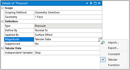 Tabular data (described in this section) represents simple tables of magnitude that are entered directly into Mechanical. For example, for Force, you can enter a table of the magnitude of the force on the boundary versus time.