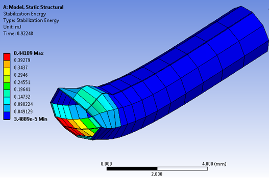 Stabilization can help with convergence problems, but it can also affect accuracy if the stabilization energy or forces are too large. Although Ansys automatically reports the stabilization force norms and compares them to internal force norms, it is still very important to check the stabilization energy and forces to determine whether or not they are excessive. If the stabilization energy is much less than the potential energy (for example, within a 1.0 percent tolerance), the result should be acceptable. Stabilization energy is not available to the Samcef or ABAQUS solver.