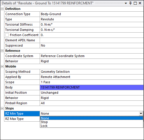 For joints with free relative DOFs, the Details pane displays a group of options labeled Stops. This grouping displays the applicable free DOFs (UX, UY, UZ, ROTX. etc.) for the joint type from which you specify the constraint as a or a (as shown below). By default, no Stop or Lock is specified, as indicated by the default option, . You can select any combination of options. For stops and locks, the minimum and maximum values you enter are relative to the joint’s coordinate system.