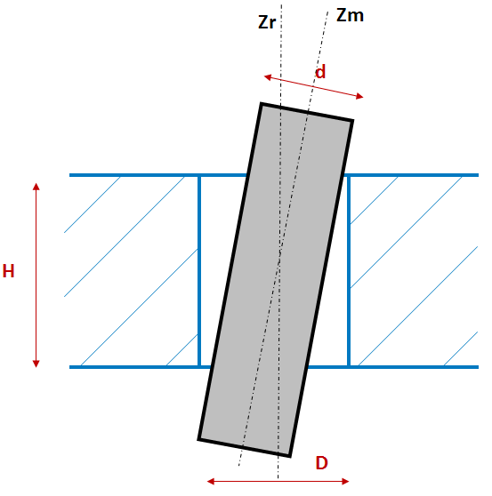 To model clearance in revolute or cylindrical joints, a special type of stop called a radial gap stop can be used. A radial gap stop limits the relative rotation of either the X or Y rotation, limiting the Z axis tilt of the joint's mobile coordinate system with respect to the Z axis of the reference coordinate system. This stop idealizes a revolute joint with a gap between the inner and the outer cylinder that allows the shaft to translate and tilt in the outer cylinder, as shown on the following figure: