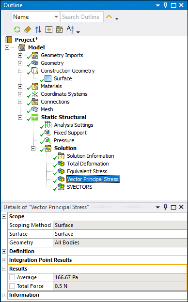 When using a Surface as your scoping method for results, and based on the result type, the application creates results for an Average as well as a total quantity, such as Total Force. You can parameterize these properties.