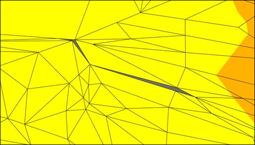 If you specify a Surface result on a mesh so fine that an entire element fits inside the cutting plane, you may see gaps or degraded mesh display, as illustrated below. This occurs because the Surface has a small — but not zero — thickness, and the application intersects the Surface with element edges to create facets. In addition to mesh display issues, numerical result values can also degrade because certain facets (and nodes) may contribute to the result when they would not if the surface thickness were set to zero (0).
