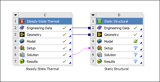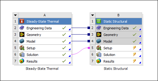 Note: When there is a shared model that includes a thermal-stress analysis and the structural system is duplicated using the Engineering Data, Geometry or Model cell context menu, the result is the Setup cell of the Thermal system linked to the Solution cell of the duplicated structural system. Temperature transfer to the duplicated structural system will require the data to be mapped and interpolated between the source and target meshes.