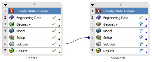 Use the workflow below to perform a submodeling analysis using linked thermal systems. You should review the Data Transfer Mesh Mapping content in Appendix C of the Help. This section describes the various Details view properties associated with the loading types for the submodeling feature. Refer to this section as needed during your analysis.