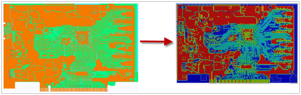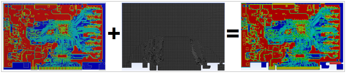 Mapping takes place in two stages. As illustrated below, during the first stage, a representation of the layout is built upon a rectangular grid using the data from a specified ECAD layout. The cell size of the grid is governed by the smallest features in the layout that have to be resolved. This size can be controlled by the user and should be specified based on the resolution required. A metal fraction value is assigned to each cell depending on the contribution of metal to that cell. The metal fraction value ranges from 0 to 1, where the 0 value represents a pure dielectric material and 1 a pure metal material.