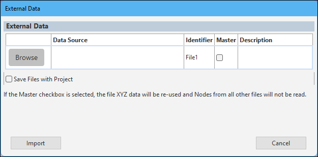 From the Materials object, select the Imported Trace option. The application automatically inserts the Imported Trace object into the tree and the External Data dialog displays. You use this dialog to specify the desired external file(s) you wish to import.