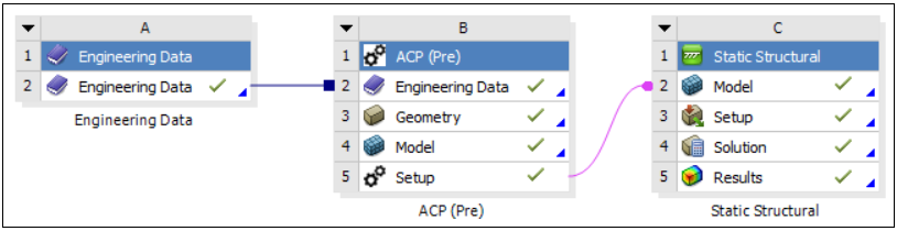 All postprocessing functionalities for a composite model are available directly in the Mechanical application's model. When a Static Structural system is linked with the Engineering Data, Geometry, and Model of the ACP (Pre) component, the composite definitions (section data) are automatically transferred to the Static Structural system. The Mechanical application uses two composite tools embedded in the Solution branch: the Composite Failure Tool and Composite Sampling Point Tool. The Composite Failure Tool calculates the Inverse Reserve Factor, Safety Factor, and Margin of Safety. The Composite Sampling Point Tool enables you to evaluate stresses, strains, failures, and material information in detail at specific locations within the composite laminate.
