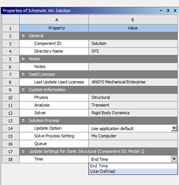 Right-click the Solution cell of the Rigid Dynamics system and choose Properties. Under Update Settings for Static Structural (Component) set Time to User Defined, then enter the time at which you want to transfer the loads to the system.