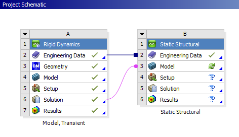On the Project Schematic, add a Static Structural system and link the Rigid Dynamics system Engineering Data cell to the Static Structural Engineering Data cell, and the Solution cell to the Model cell.