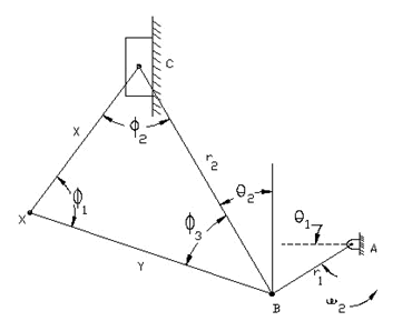 The analysis determines the acceleration of point C with a change of angle of link AB (θ 1) from 0 to 60 degrees in a counter-clockwise direction.