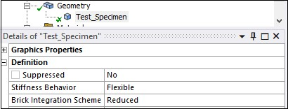 Note: Note: To turn on reduced integration, go to geometry details and set Element Control to Manual. The Brick Integration Scheme will appear under the part file details of the geometry, set this to Reduced as shown below.
