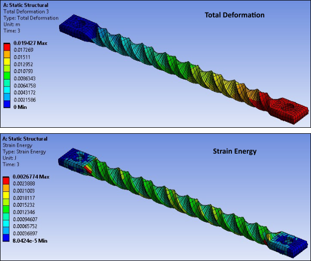 The following figure shows a contour plot of the deformation and strain energy at the end of simulation. The plot offers a general idea of the overall deformation of the specimen.