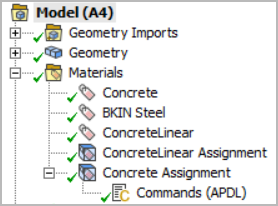 To specify the elastoplastic tangent information for the concrete material properties, insert a Commands (APDL) object in the Material Assignment Object "Concrete Assignment" and add the following commands snippet: