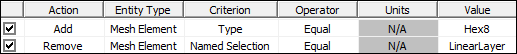 After meshing is complete, create the linear element layer named selection with the following criteria and rename it "LinearLayer".