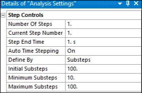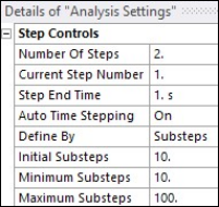 The active and passive pressure-state loads are applied via 10 initial and 100 maximum substeps with automatic time-stepping enabled.