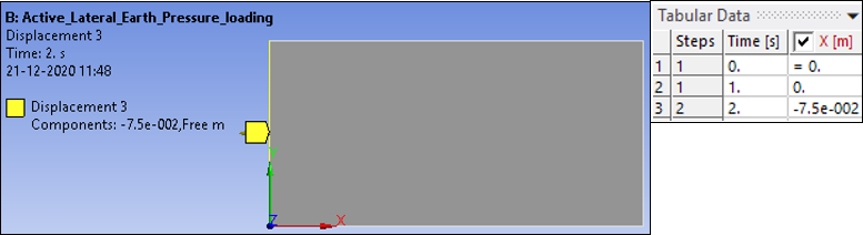 In a following load step, an active earth-pressure state is generated by horizontally moving the soil nodes of the left boundary away from the soil using a specified displacement of ux = -0.075 m. This case is accomplished by applying a displacement value of -0.075 m the second load step as shown below.
