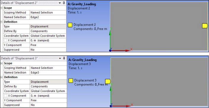 The retaining wall on both sides of the soil is assumed to be frictionless. Therefore, only a fixed horizontal movement is necessary. This is accomplished using the displacement boundary conditions shown below.