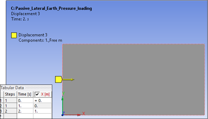 Alternatively, a passive earth-pressure state is produced by horizontally moving the soil nodes of the left boundary towards the soil using a specified maximum displacement of ux = 1 m. This case is accomplished by applying a displacement value of 1 m the second load step as shown below.