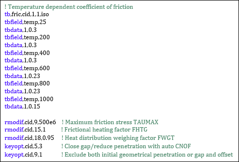 Some additional heat is also generated by plastic deformation of the workpiece material. Because the workpiece material softens and the value of friction coefficient drops as the temperature increases [3], a variable coefficient of friction (0.3 to 0.15) is defined using a command snippet issuing TB,FRIC with TBTEMP and TBDATA, (see note below).
