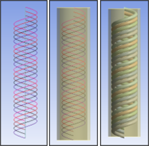 | Three methods for modeling a multi-filar coil inside of a tube. Each model uses a different contact scenario: surface-to-surface, beam-to-surface, or beam-to-beam. A comparison shows that the beam model using beam-to-beam contact offers the best advantage in terms of simplified modeling and reduced computation time. |