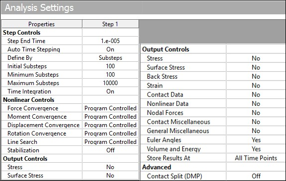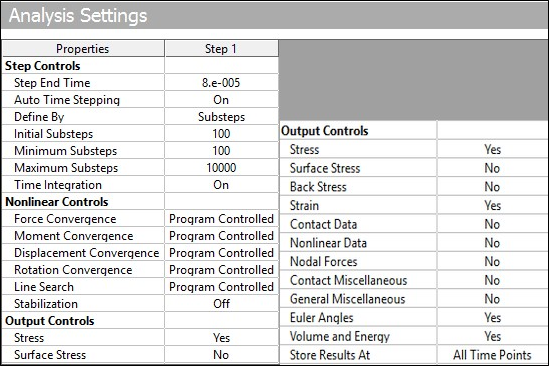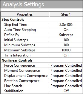 All analysis settings in this case are same as for the rigid case except for total time. The total time in this case must take into account the time that the stress wave created from the impact needs to travel back and forth through the elastic bar. The calculated time of impact is 4.405e-6 seconds and the release time is calculated analytically as 2.23e-5 seconds, so a total time of 2.8e-5 seconds is used for the elastic impact.