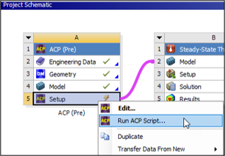 Alternatively, you can run the ACP(Pre) Python script (ACP_Setup.py) that is available through downloadable links: input files. To run the script, right-click the Setup cell of the ACP (Pre) system, choose from the drop-down menu, browse to location of the downloaded script and click open.