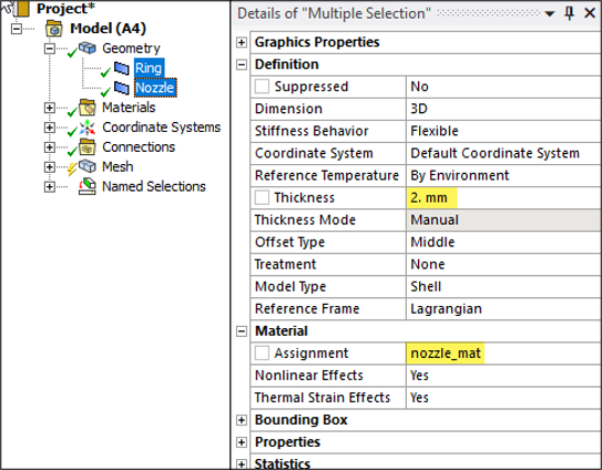 Specify Thickness as 2 mm and assign material for Ring and Nozzle in Geometry as seen below.