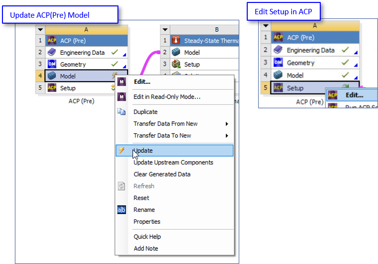 Close ACP and update the Setup cell of the ACP (Pre) system in Workbench (right-click Setup and choose Update from the drop-down menu). This completes the setup of ACP for generating composite layers.