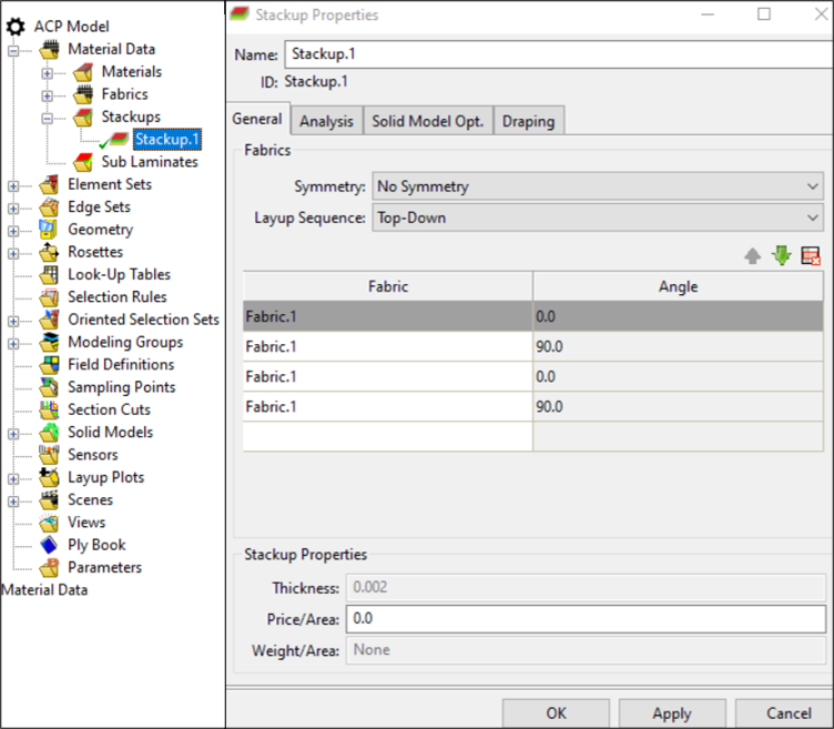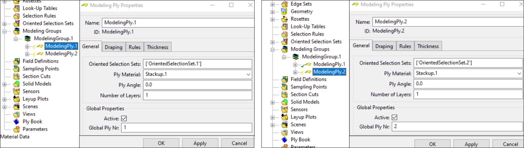 Create "ModelingPly.1" and "ModelingPly.2" as shown in the following figure. First create "ModelingGroup.1" by right-clicking Modeling Groups, selecting from the drop-down menu, and clicking . Then for each ply, right-click , select from the drop-down menu, assign the Ply Properties shown in the figure, and click then .
