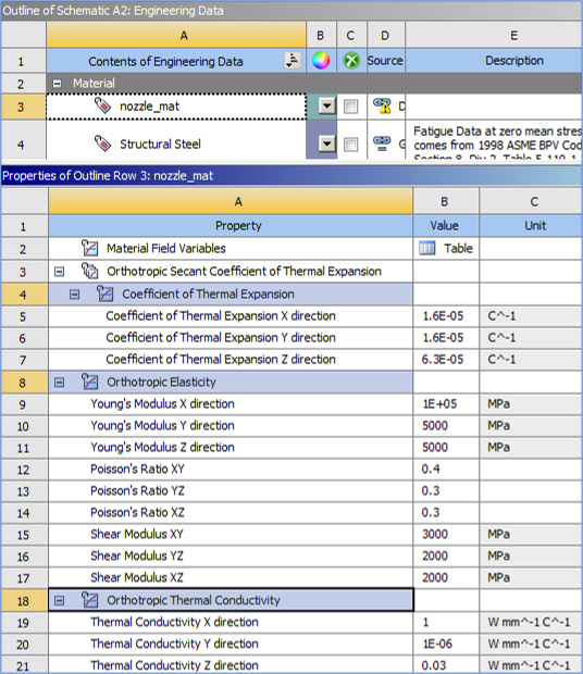 Open the Engineering Data tab by double-clicking the Engineering Data cell, and define a custom material named "nozzle_mat" with following details: