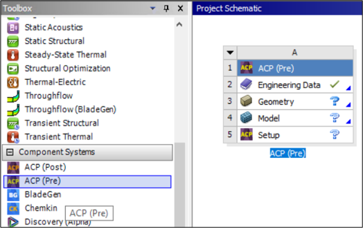Insert the ACP (Pre) component system by dragging it from the Toolbox to the Project Schematic in Workbench.