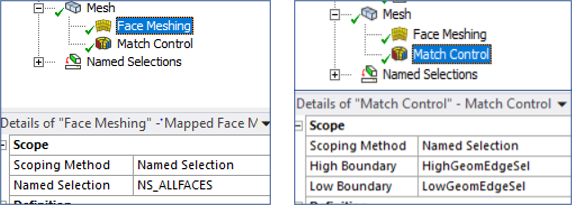 Specify the mesh using Face Meshing scoped to the named selection NS_ALLFACES and Match Control scoping the High and Low Boundaries to the named selections HighGeomEdgeSel and LowGeomEdgeSel, respectively, as shown below. Then generate the mesh.