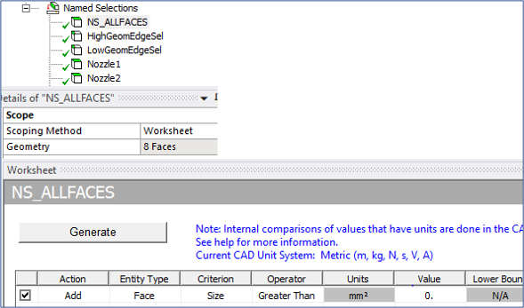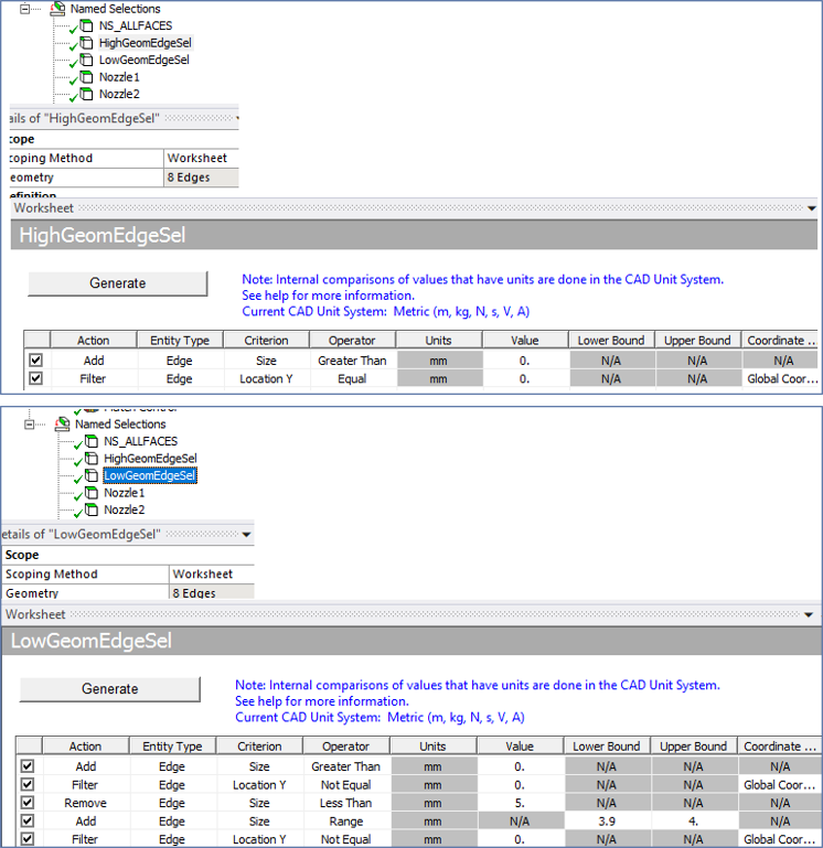 Define named selections. See the details of three named selections below: NS_AllFaces, HighGeomEdgeSel, LowGeomEdgeSel.