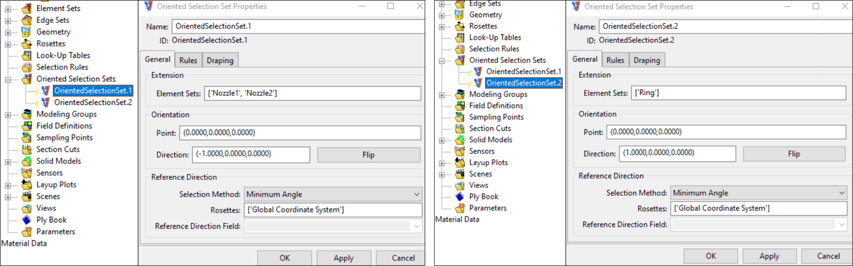 Create "OrientedSelectionSet.1" and "OrientedSelectionSet.2" as shown in the following figure. For each, right-click Oriented Selection Sets, select from the drop-down menu, assign the Oriented Selection Set Properties shown in the figure, and click then .