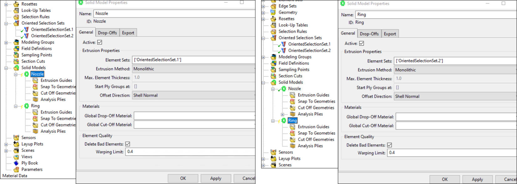 Create solid models, "Nozzle" and "Ring", as shown in the following figure. For each ply, right-click , select from the drop-down menu, assign the Solid Model Properties shown in the figure, and click then .