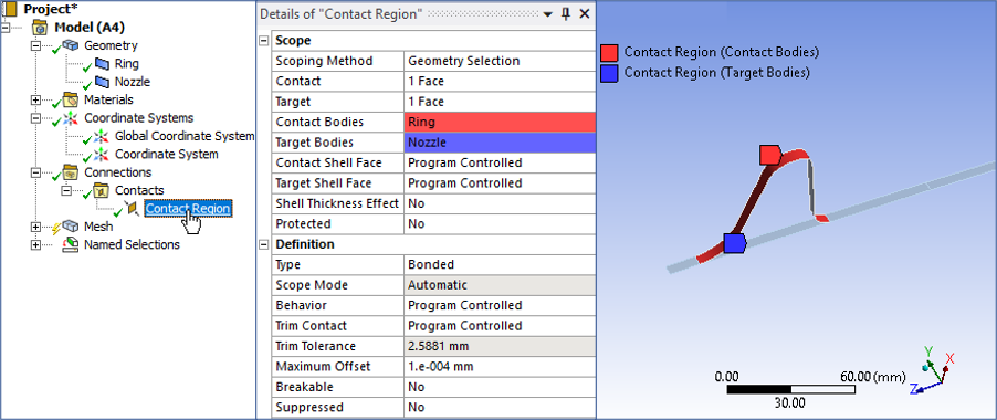 The following figure shows the details of the Bonded contact region between the ring and nozzle.