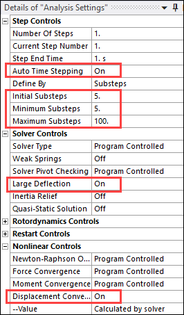The structural analysis is solved using the Analysis Settings shown below. Settings of interest are highlighted.