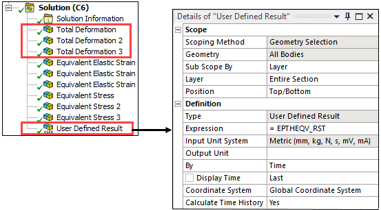 Total Deformation results are inserted and scoped to All Bodies (default), Line_Bodies (a named selection), and Shell_Bodies (a named selection). A User Defined Result is inserted with expression EPTHEQV_RST to obtain equivalent thermal strain.