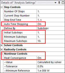 The thermal analysis is solved using the Analysis Settings shown below. Settings of interest are highlighted.