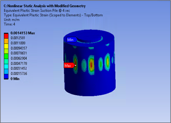 Loading on the suction pile leads to plastic strains in the soil as shown in the following figure. Plastic strains are distributed asymmetrically due to the asymmetrical loading in load step 3 and load step 4.