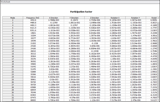 Prior to solving a harmonic response analysis, it is important to understand the frequency content of the system, and the modal analysis provides this valuable information. In the solution information, the participation factor summary is available under solution output.