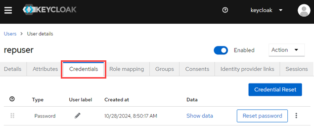 For more information see Defining user credentials in the Keycloak Server Administration help.
